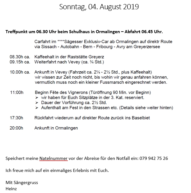 Singen am Samstag den 30.03. in der Mehrzweckhalle in Ormalingen. Einsingen 13.45 Uhr. Auftritt ca. 14.20 – 14.40 Uhr. Singbuch Männerchor mitnehmen. Plämpel anziehen. Wann immer möglich: Vollzählig.